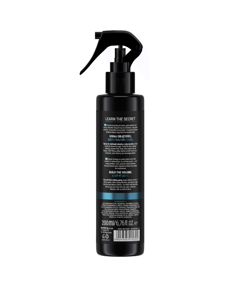 W składzie znajduje się sól morska, odpowiedzialna za charakterystyczną teksturę i podkreślenie skrętu, a także pantenol, który zapewnia nawilżenie i wzmacnia strukturę włosa. Gliceryna chroni przed przesuszeniem, dbając o miękkość i elastyczność kosmyków. Formułę uzupełniają naturalne olejki eteryczne, m.in. cytrynowy, lawendowy i eukaliptusowy, które nadają produktowi świeży aromat i dodatkowe właściwości pielęgnacyjne.
